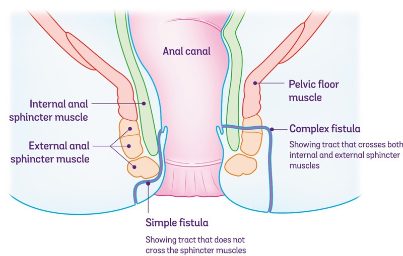 • Complex fistulas involve the sphincter muscle and may have several linked tunnels. They can also come with abscesses or may connect with the bladder and vagina.